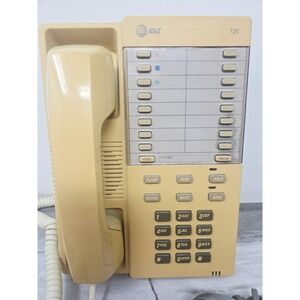 The Vintage AT&T Corded Speakerphone 720 is a retro-style telephone with a beige color and removable mount for desk or wall use. It features 3 one-touch dial buttons, hold and redial buttons, 12 number memory, and speakerphone capabilities. Made in Thailand, this corded telephone by AT&T is a nostalgic piece that adds a touch of vintage charm to any home or office. Perfect for those who appreciate classic communication technology and want a unique addition to their workspace.