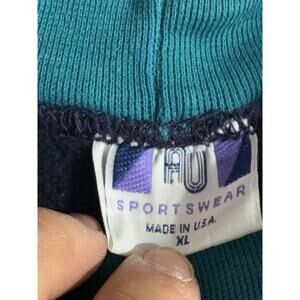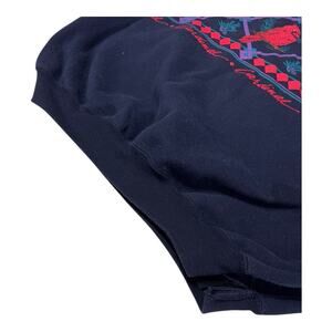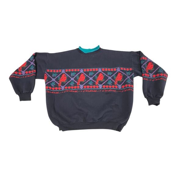 The Vintage AU Sportswear Black XL Cardinal Geometric Motif Collared Sweatshirt is a stylish and comfortable pullover perfect for winter activewear. Made of a cotton blend knit fabric, this sweatshirt features an embroidered geometric motif and a collared neckline with raglan sleeves. It is machine washable and has a regular fit, making it easy to care for and versatile for everyday wear. The black color with red cardinal accents adds a pop of color and a touch of retro flair to this classic piece, ideal for women who love a 90s-inspired style.