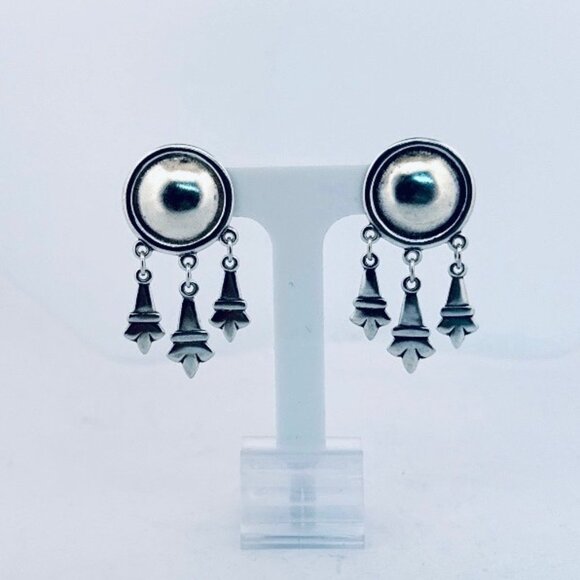 These beautiful vintage sterling silver earrings feature a bold domed circular top accented by three articulated geometric dangle drops on each earring. Crafted in solid Sterling Silver 925 and marked © AVER STER, they display classic Mexican artisan styling with dimensional shapes and oxidized details that enhance the depth of the design.