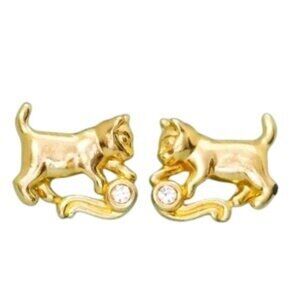 A pair of vintage AVON Goldtone Kitten "Perfect Love" pierced earrings. Each playful kitten earring is adorned with a clear rhinestone.