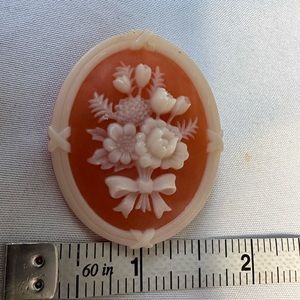 This beautiful pin is from my collection and I absolutely love it but it’s time to let another fashionista enjoy this work of art. The cream colored flowers look like roses and daisys some are open and some are closed. It has a beige cream picture frame edge with a peach colored background on the design.