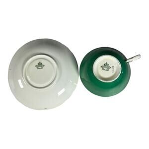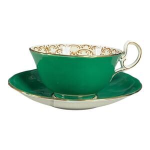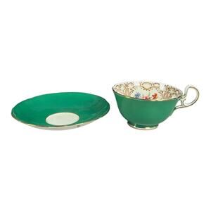 This vintage Aynsley tea cup and saucer set is a delightful addition to any collection. Crafted from fine bone china, the set features a vibrant green color and a beautiful floral bouquet design.