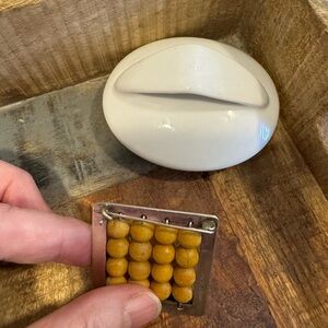 Vintage Aarikka brooch from Finland. Yellow wooden beads in a silver square. I have been told that this is silver. However, it does not have the silver 925 sign anywhere.