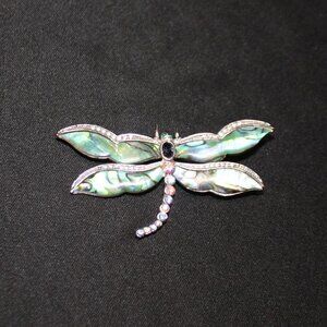 Beautiful vintage dragonfly brooch. The wings are covered in abalone shells trimmed with tiny sparkling rhinestones. The body is a blue facet cut rhinestone and the tail has alternating pink and blue rhinestones.