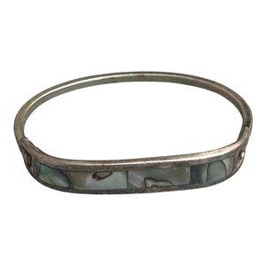 Crafted with elegance, this vintage bangle features stunning abalone inlay set in sterling silver. Its unique design and hinged closure ensure it captures attention. This piece offers a timeless style that complements various outfits, making it a versatile addition to any jewelry collection.