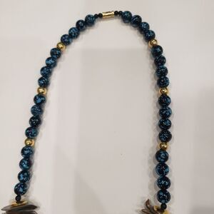 This is a fabulous, unique vintage abalone shell necklace. It features a large pendant surrounded by black and gold beads of various sizes. It’s finished off with a secure, gold ribbed barrel clasp. The necklace hangs approximately 14.5”. The peacock blues, greens and wonderful hints of purples on this Paua Abalone shell work so well with the black, skillfully placed beadwork.
