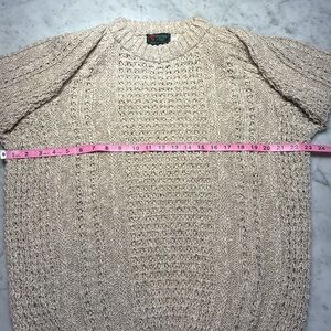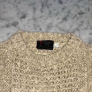 This cream fisherman sweater features a thick and substantial chunky cable-knit pattern that adds visual texture. The long sleeves have a relaxed fit with slightly dropped shoulders, making it a comfortable choice for casual wear. This item was hand woven in Ireland in the 70s. Garment is in great condition despite its age. No stains, any discoloration in the photos is due to lighting