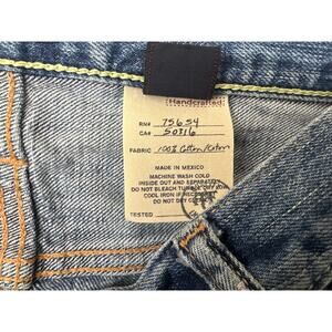 These jeans are *heavily* distressed. Partly due to the fact that they were made that way but there is wear on the back bottom hems from where the jeans were likely too long for the person who wore them. They could be hemmed or rolled up. Super cool to know that these were handcrafted...