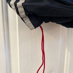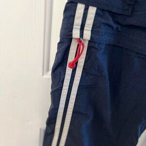 Cinch cords on the legs and waist , lined with grey cotton , zippered front pockets , hook & loop back pocket