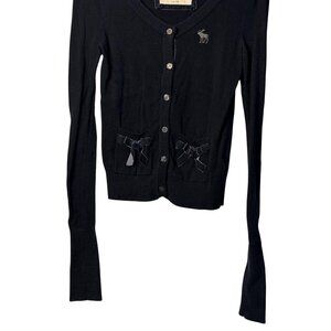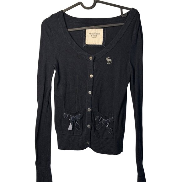 Abercrombie & Fitch cardigan, small LS sweater, navy blue top, Bella Swan style, Y2K fashion, vintage Abercrombie, early 2000s casual, preowned womens sweater, bow pocket cardigan, iconic Y2K top
