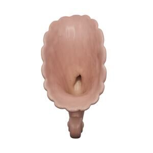 This is a vintage Abingdon Pottery vase, stamped on the base “Abingdon U.S.A.”. The vase features a graceful scrolling cornucopia shape with a soft pink matte glaze, characteristic of Abingdon’s mid-century art pottery.