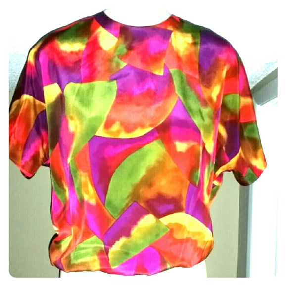 Multi-colored vintage abstract blouse, short sleeve, there is a band at the waist. Good condition.