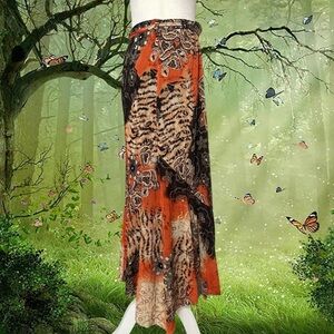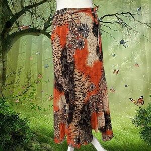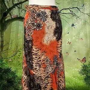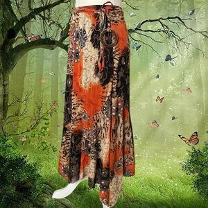 Orange and brown maxi wrap skirt with floral and feather print, glitter detailing, asymmetrical, perfect summer skirt, # boho