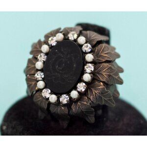 This is a vintage size 8 ring with gothic floral design that has faux pearls and rhinestones.