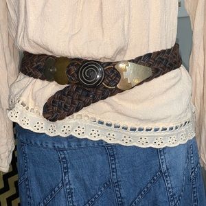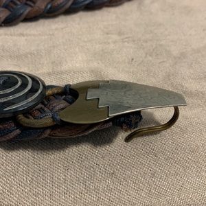 Black and brown woven with kind of ARTCORE or Desertcore possibilities. No tag no brand no material. But there is no flaking anywhere whatsoever. Not even any tarnishing on metal if that is a thing. My natural waist is a 31 and I can’t wear this slung. It’s weird defining my waist. Needs to be messier. So setting it free because I love it!