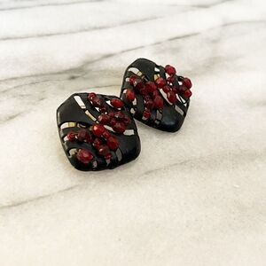Vintage Abstract Seed Bead Earrings Red Beads Black Metal Diamond Shape Stud