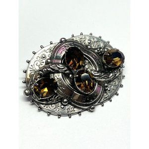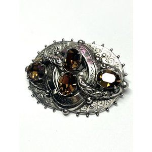 Vintage Accessocraft NYC Brooch Pin. Silver tone tiered brooch pin. Signed on back. Beautiful engraved design with prong set Brown glass stones. Vintage pin. JH37H.