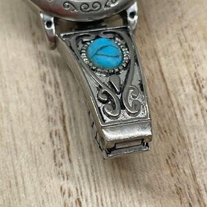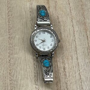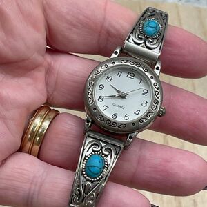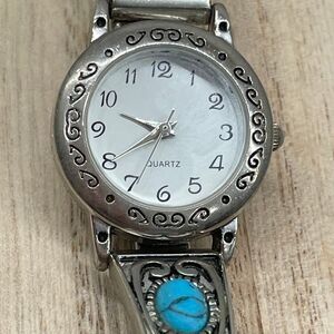 Western vibe for women. Most likely faux stones on band... but looks very nice. Good preowned condition with newer battery and works great. See all images for condition and more info.