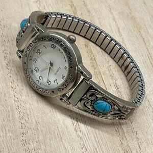 Vintage Accutime Quartz Silver Tone Band Women's Watch Turquoise Stretch Wrist