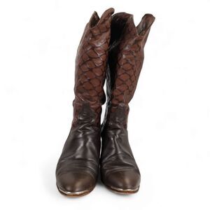 Vintage late 70's to 80's. Pull-on calf high western style boots feature a geometric embossed pattern in the leather, curved cone stacked leather heel, metal tipped on toes and backs of heels, fabric lining. Have been resoled by previous owner.