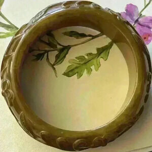 Vintage Acrylic Bangle in army green center hole 2 1/2” width 1” in gently used condition some minor dings please see pictures for reference