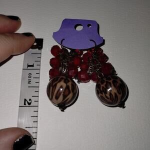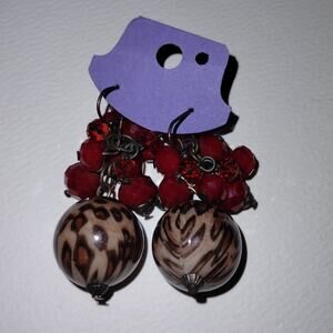 Vintage Acrylic Leopard Cheetah Ball Red Beads Dangle Drop Costume Earrings