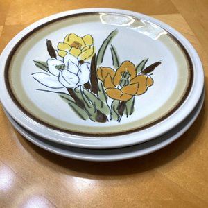 Vintage 1970’s ACSONS ‘Adela’ Brown, Green, Yellow, Orange and White Flowers Design 10.5" Set of 2 Dinner Plates Stoneware Made in Japan. Oven Proof (i.e. Oven Safe).