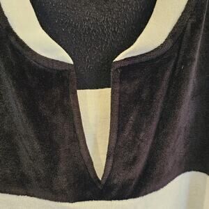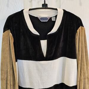 Vintage Action 1980s V-Neck Striped Velour Sweater Ribbed Cuffs Black/Tan Sz XL