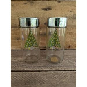 These glass salt and pepper shakers with a Christmas tree painted on each are in excellent vintage condition. No chips, cracks or breaks and the lids have no rust or discoloration. The shakers measure 4.75" tall and are 2" in diameter.