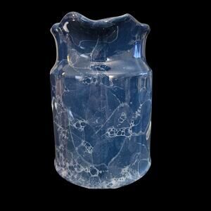 Beautiful vintage pottery pitcher marked “Action Pallian” on the base. Features a glossy blue glaze with a distinctive white bubble or foam pattern, often seen in mid-century Italian-style ceramics. The pitcher has a gently scalloped rim, sturdy handle, and vibrant blue finish. Measures approximately 6" tall. Excellent vintage condition with only light wear consistent with age. Likely Italian in origin, though not marked as such.