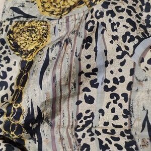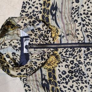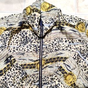 Vintage bomber jacket with extra drip 😜 100% silk. Super dope print, that includes different shades of tan, a little blue-grey, chain which always gives me alittle Versace vibe and cheetah print 👌 High neck zip, by the vintage brand “Activology”in great condition!!! A great addition to really add extra spice to your closet. does have on edge of right sleeve wrist area 4 small shreds. see last pic. it's a size large the measurements are approximately from pit to pit 24.5 in and from shoulder to the bottom is 27 in in length really a nice looking windbreaker jacket