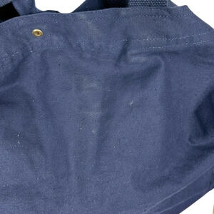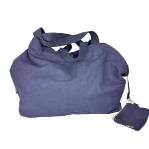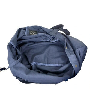 The washed canvas bag features a large star print on the front, double handles for shoulder as well as hand-carrying, 2 interior open pockets and a matching detachable coin purse. Magnetic snap main closure as well as additional snaps at top sides. Unlined. Made of recycled fabric