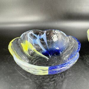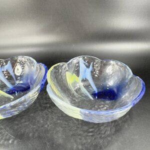 Vintage Aderia Glass Bowl Set 2 Made In Japan Clear Blue Yellow Swirls Ruffled