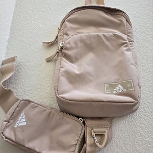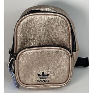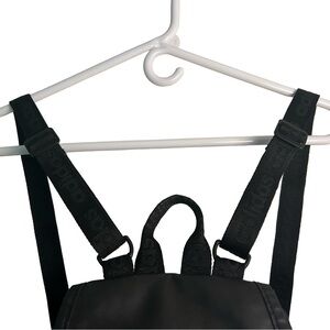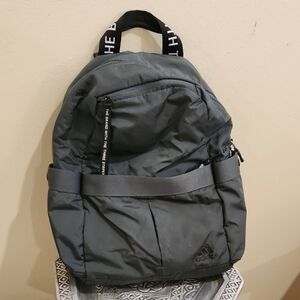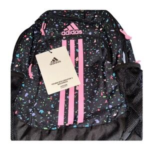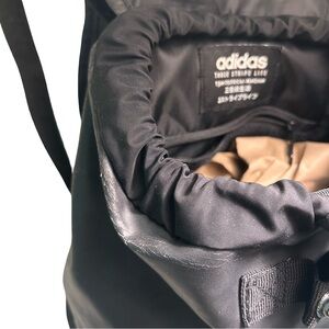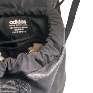 Compact black backpack with adjustable straps. Front zipper pocket for easy access. Iconic Adidas logo on the flap. See pictures for worn area.