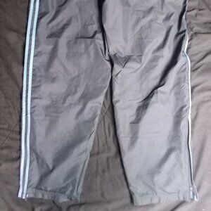Vintage Adidas ClimaProof Stripe Mesh Lined Wind Pants Joggers Trainers, Side Pockets, Rear Velcro Pocket, Zippers At Ankles, May 2004, Size X-Large - Measures Adjustable Drawstring Elastic Waist(Flat)=14.5" Inseam=31" Front Rise=15" - Excellent Condition, No Flaws - Gray Color Pants With Blue Stripes