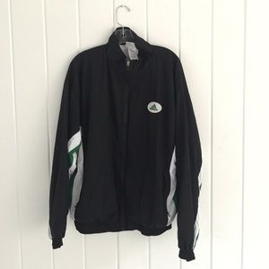 hello everyone! this jacket is a vintage adidas windbreaker. The sizing is a men's large, but I am an average sized female and it fits me perfectly. The inside lining is white cotton material. The outside is waterproof polyester. The jacket itself is in mint condition!! :-) contact me for further questions.