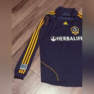 Navy LA Galaxy jersey with yellow stripes. Features Herbalife logo and team crest. Long sleeves for comfort.