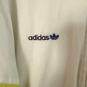 The Vintage ATP TOUR Adidas Jacket is a comfy and stylish piece of men's clothing, made in France in the 1990s. This jacket features a classic white color with long sleeves, zip pockets and is crafted from a comfortable cotton blend material. with a chest size of 50 inches and a length of 30 inches, this jacket in size XL is perfect for any tennis enthusiast looking to add a touch of retro style to their wardrobe.