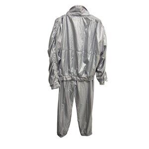 retro sport, athleisure, workout, running, vintage tracksuit, Adidas silver suit, retro Adidas outfit, shiny tracksuit, Adidas logo clothing, silver sportswear, Adidas S tracksuit, ruched sleeve outfit, classic Adidas style, lightweight