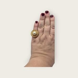 Add a touch of timeless elegance to your jewelry collection with this stunning vintage adjustable statement ring. Featuring a beautiful gold-tone setting with an intricate textured design, this ring is adorned with a large faux pearl at its center, exuding classic sophistication. The adjustable band ensures a comfortable fit for most sizes. Perfect for vintage jewelry lovers, cocktail parties, or everyday glam!