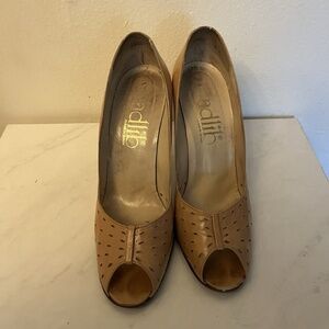 Vintage Adlib tan peep toe heels. Tan color with pattern on the toes. Good pre-owned condition. The inside lining has some stains. One of the heel tips is twisted. These originally retailed for $80 in the 1980s.