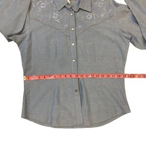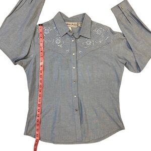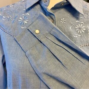 Vintage Adobe Rose Pearl Snap Western Shirt in Blue Chambray with same color embroidery on the upper chest.