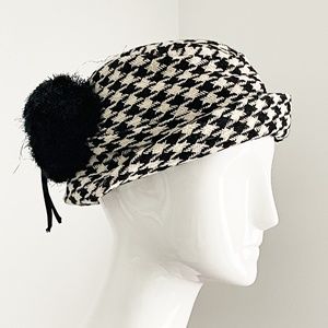 Made from a black & white houndstooth knit, the hat features a black pom pom in back and the scarf is fringed. The hat measures 22.25" circumference and best fits a size 56 or 6 7/8. The scarf measures 52"L x 11"W. Both pieces in good condition for their age, with some signs of age & prior wear: hat is pressed from storage; back pom is somewhat loose. Hat is tagged ADOLFO II
