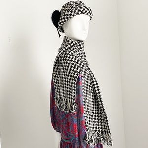 Authentic, preowned, vintage Adolfo II Houndstooth Wool Knit Hat & Fringed Scarf, 2pc set, likely made in the late 70s.