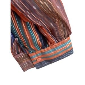 This Vintage Adolph Schuman for Lilli Ann Bow Retro Secretary Striped Blouse in size Large is a stylish and versatile top perfect for various occasions. Made from satin fabric in a retro-inspired design, this blouse features a collared neckline, button closure, and a charming neck bow accent. The semi-sheer striped pattern adds a touch of elegance, while the long puff sleeves and single button cuffs give it a classic and sophisticated look. Perfect for summer, fall, or spring, this blouse exudes a timeless glam vibe suitable for a party, cocktail event, workwear, or business attire. Made in the United States.