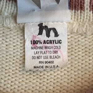 Vintage Adriella women's knit sweater, made in the USA. Features a cream acrylic knit with textured heart pattern, floral fair isle accents, and a dusty rose fringe hem.
