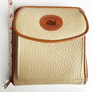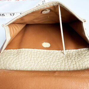 Streamlined and practical, this vintage Adrienne Picard organizer belt bag is crafted from durable 'All Weather' pebble-textured leather in a neutral beige tone with tan trim. Designed to slip onto a belt (fits up to 2" wide, belt not included), it’s perfect for hands-free convenience while keeping essentials secure.