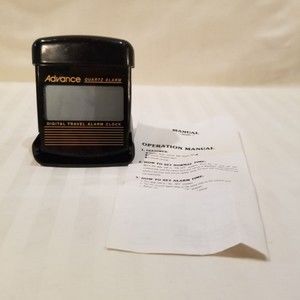 Vintage Advance sm digital alarm clock w/instruc. Slide bottom section to open and flip under to put on table tor tracel. I tested it and it does work nicely. Has small instruction paper with it. 3" by 2 1/4" overall.