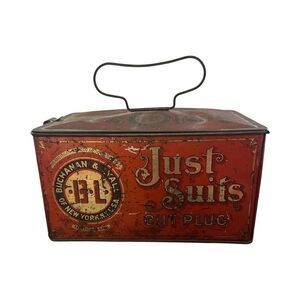 Add a touch of nostalgic charm to your collection with this Vintage Just Suits Cut Plug Tobacco Tin. Designed as a lunch box with a sturdy metal handle and latch, this unique advertising piece dates back to the early 20th century. Its vibrant red graphics, featuring the “Just Suits” logo and Buchanan & Lyall branding from New York, showcase the iconic craftsmanship of vintage tobacco tins.