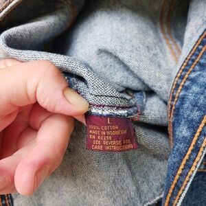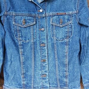 It's a vintage blue jean jacket with the logo on the buttons down the front. It has 2 chest pockets and 2 side pockets. It's in good pre-owned condition Size Large